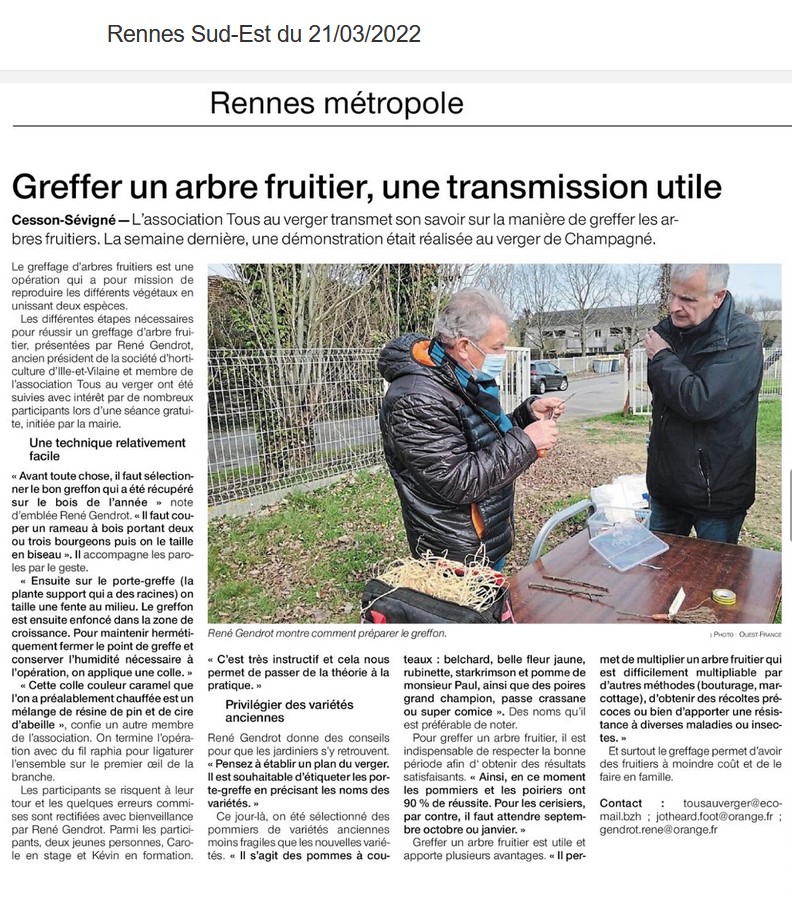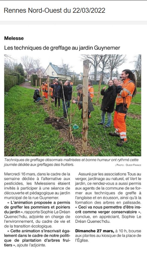 | Fin février, initiation au greffage d'arbres fruitiers | Montreuil le Gast | 12 fevrier 2022 | Ouest France - Pdf |